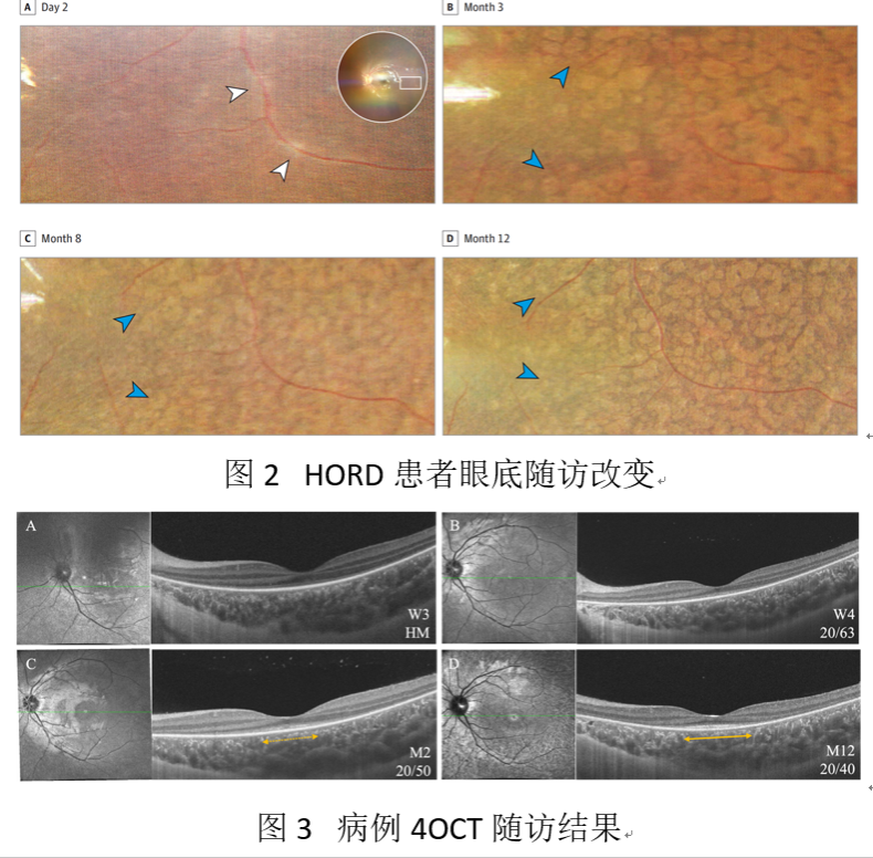 眼底檢查顯示在急性期,可見視網(wǎng)膜血管旁類白鞘樣改變(圖2A);3個月隨訪(圖2B)時,可見圓點狀色素改變;8個月(圖2C)和12個月(圖2D)時,這些點狀病灶逐漸融合,最終形成彌散性色素改變。這種動態(tài)色素變化是HORD的重要臨床特征,提示外層視網(wǎng)膜的持續(xù)性病理過程。