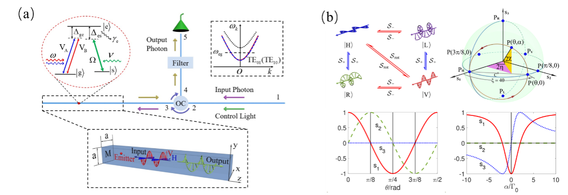 光子具有多自由度編碼、長相干時間和超快傳輸速度等優(yōu)點,成為理想的信息載體。光子集成芯片具有高穩(wěn)定性、高可擴展性、微型化以及高移動性等優(yōu)點,近年來受到廣泛的關注。偏振是光子信息編碼的最重要資源,但在光子芯片上對光子的偏振態(tài)實現(xiàn)按需的任意調(diào)控一直是一個巨大的挑戰(zhàn)?;陔p折射晶體或者法拉第磁光效應等方法的傳統(tǒng)偏振極化器一般體積較大,很難片上集成。盡管溫控折射率調(diào)控等方法被提出用于片上實現(xiàn)光子偏振的轉(zhuǎn)化調(diào)控,但是整個結構的體積仍然較大,且響應速度較慢。為克服這一重大挑戰(zhàn),該團隊提出一種片上光子偏振調(diào)控的量子光學新方法:將一個三能級量子輻射子(原子或分子或量子點)集成于光波導中,使其與兩個正交偏振波導模相互作用,并通過外部相干光場進行調(diào)控,從而實現(xiàn)對輸入光子偏振的按需轉(zhuǎn)化。該方法具有以下突出優(yōu)勢:首先,偏振轉(zhuǎn)換器是原子尺度,非常有利于片上集成;其次,通過調(diào)節(jié)外部相干驅(qū)動場的頻率和強度,可以在寬帶范圍內(nèi)按需操控偏振轉(zhuǎn)換,而無需改變結構,且響應速度快;第三,由于類電磁感應透明(EIT-like)效應,該方法具有良好的抗耗散能力和高轉(zhuǎn)換效率。該工作為實現(xiàn)片上光子偏振編碼和按需調(diào)控提供了一種有效的解決方案,將推動高密度信息編碼和信息處理光量子集成芯片的發(fā)展。