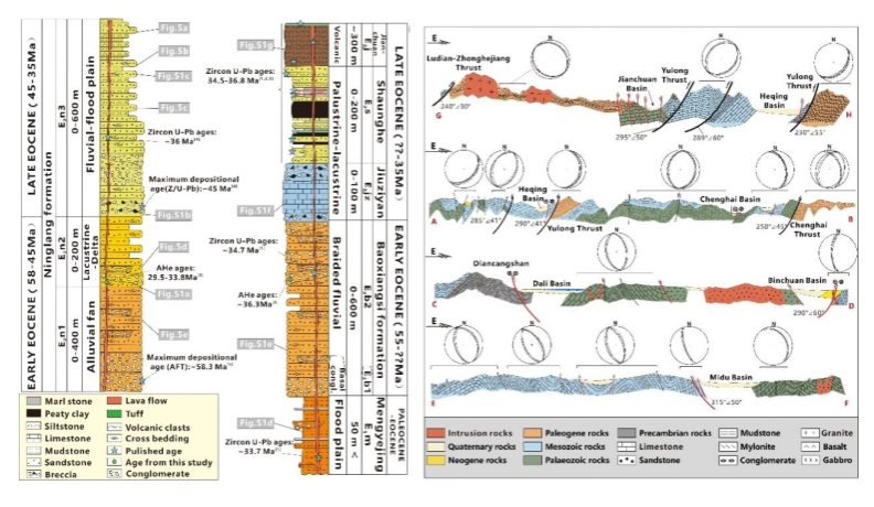 本研究的構(gòu)造和沉積觀測結(jié)果表明,該區(qū)在58-36Ma期間發(fā)育的一系列的沉積地層經(jīng)歷了明顯的縮短變形(圖三),指示了該區(qū)在始新世晚期至漸新世/中新世早期廣泛發(fā)育了逆沖-褶皺體系,并伴隨有區(qū)域性的快速剝露與地貌隆升。