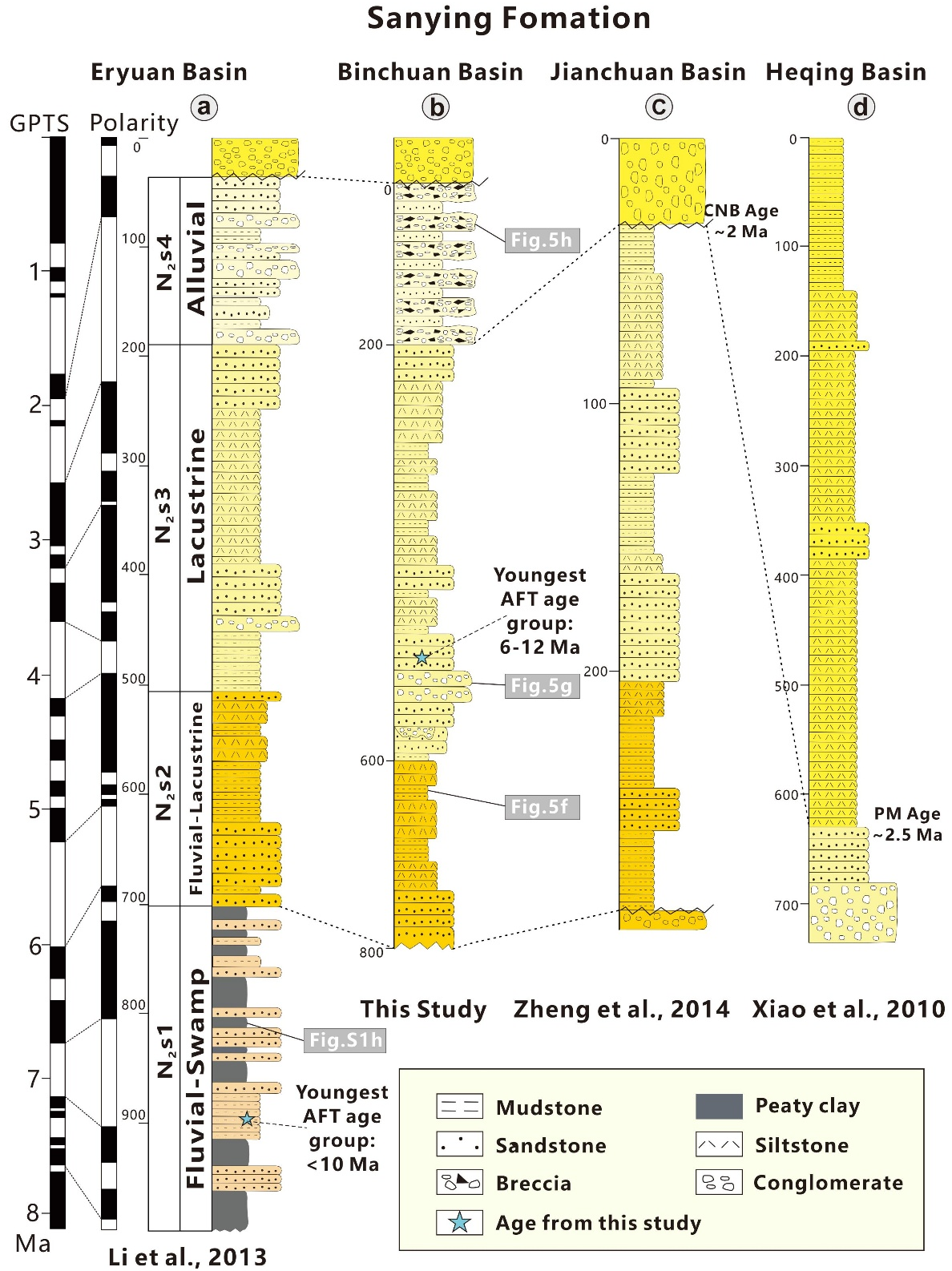 滇西地區(qū)盆地內(nèi)沉積的最老新近系地層約為7.8Ma(圖四),盆緣斷裂具有顯著正斷分量,碎屑磷灰石AFT數(shù)據(jù)指示該區(qū)在~10Ma發(fā)生加速剝蝕,這些證據(jù)暗示了該區(qū)域在中新世晚期-上新世期間轉(zhuǎn)換為伸展構(gòu)造,并形成盆-嶺相間的地貌景觀。