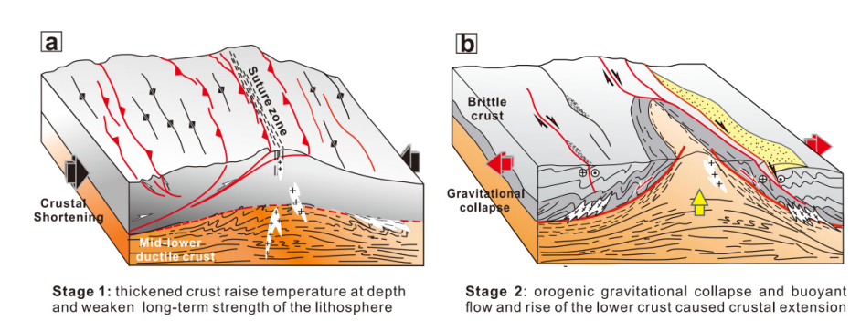 綜合地質(zhì)與地球物理觀測,本研究提出斜向匯聚帶的地殼增厚過程使得深部地殼溫度升高,弱化了下地殼與上地幔的強(qiáng)度(尤其是在富水的條件下),并導(dǎo)致造山作用晚期的重力垮塌,驅(qū)動滇西北裂陷系發(fā)生顯著的構(gòu)造轉(zhuǎn)換(圖六)。