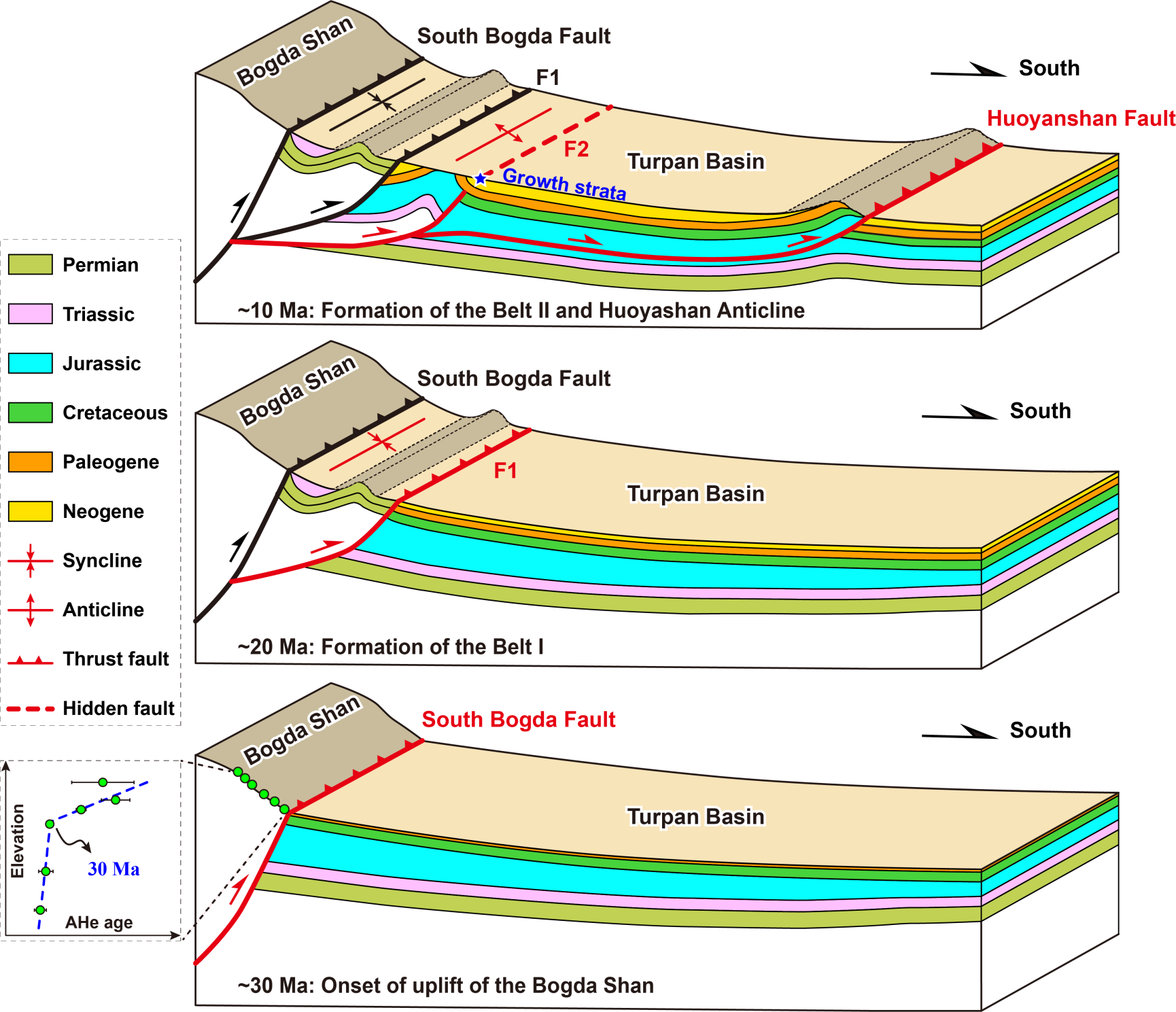 本文結(jié)合低溫?zé)崮甏鷮W(xué)方法和生長(zhǎng)地層分析,對(duì)吐魯番盆地北部塔爾郎河流域發(fā)育的Belt I、Belt II以及盆地內(nèi)部中央褶皺逆沖帶中的火焰山背斜的變形時(shí)間進(jìn)行了限定,主要結(jié)果如下:
