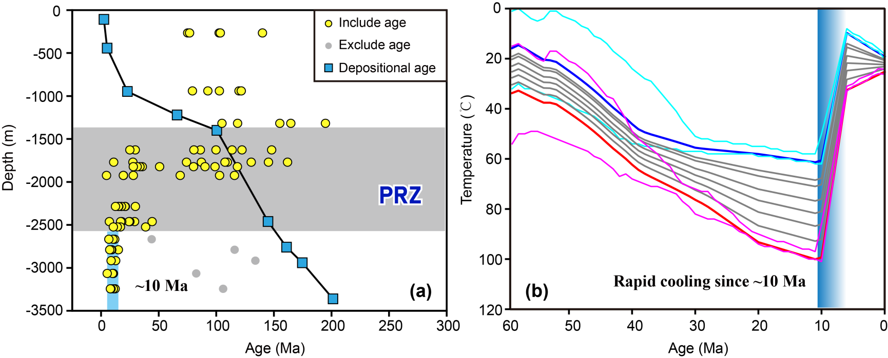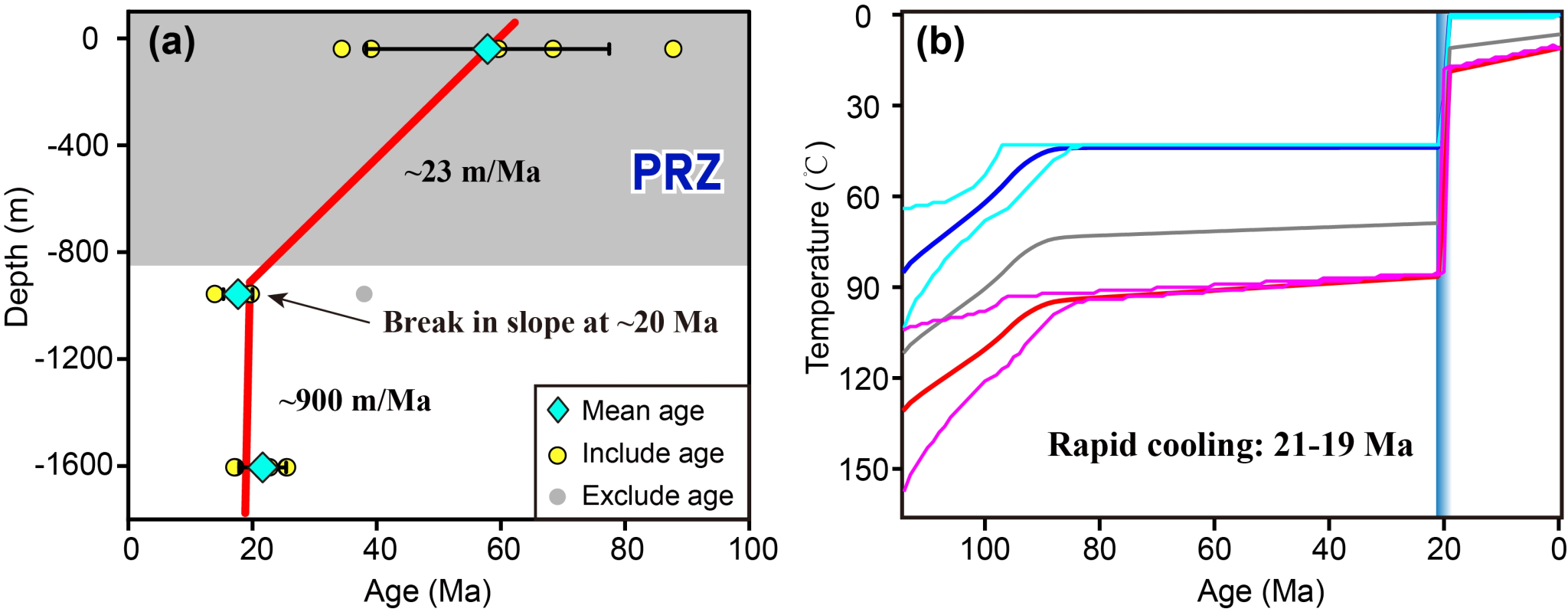 (1) AHe年齡-深度關(guān)系和熱歷史模擬結(jié)果表明,Belt I自約20 Ma開始快速剝露(圖2);
