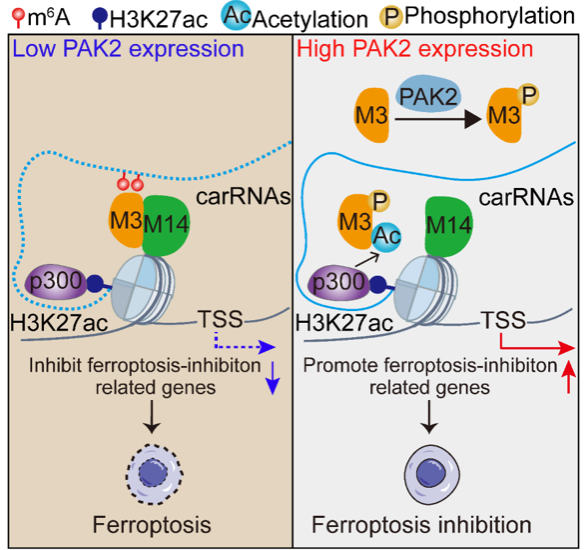 2025年3月17日,中山醫(yī)學院王金凱教授課題組在《Molecular Cell》上發(fā)表了題為“Spatial control of m6A deposition on enhancer and promoter RNAs through co-acetylation of METTL3 and H3K27 on chromatin”的研究論文。該工作發(fā)現(xiàn)p300主要在H3K27ac染色質(zhì)上催化METTL3乙?;?,從而抑制METTL3與METTL14的結(jié)合使METTL3脫離H3K27ac染色質(zhì),因此特異性地降低增強子RNA(eRNA)和啟動子RNA(paRNA)的m6A修飾水平促進鐵死亡抑制基因的表達。在腫瘤細胞中高表達的激酶PAK2能夠通過磷酸化METTL3而促進METTL3的乙?;?,從而抑制腫瘤細胞鐵死亡的發(fā)生(如圖)。