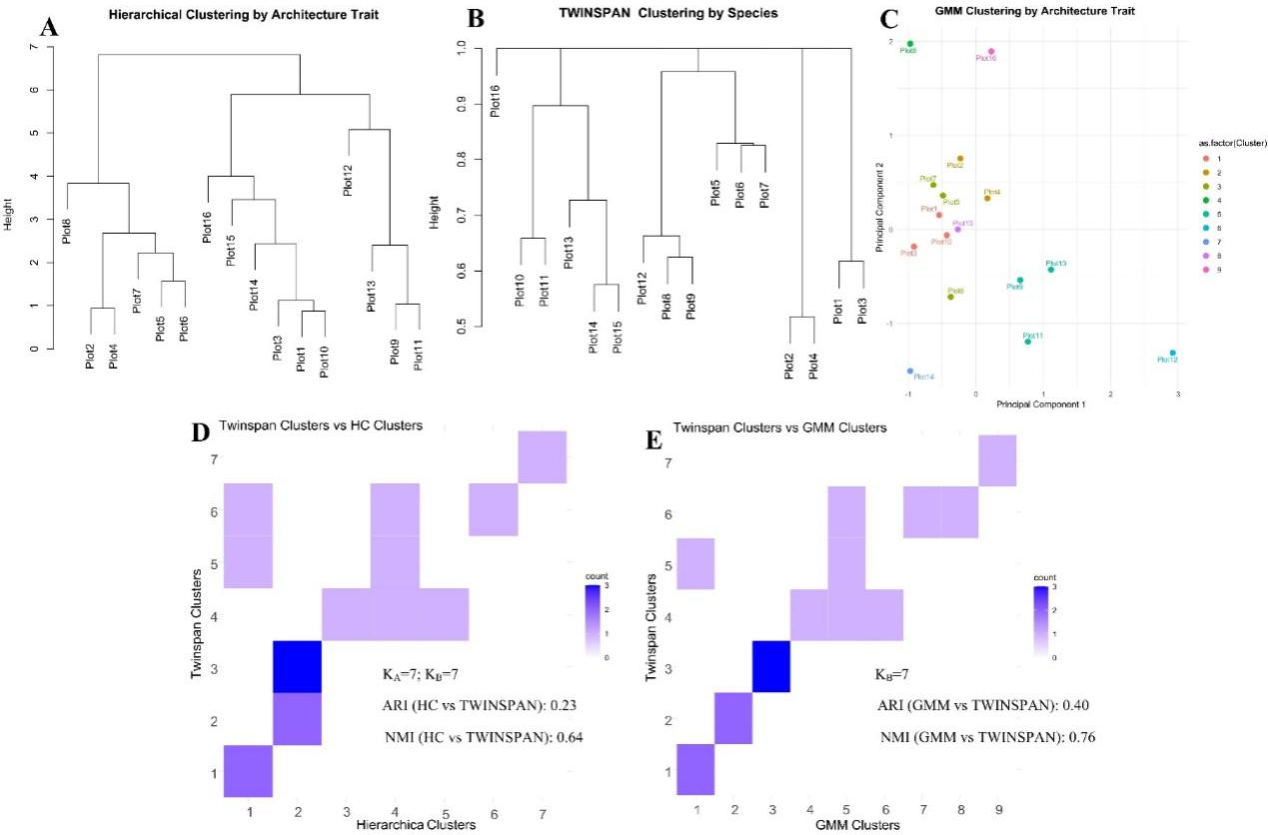 圖2 針對(duì)CDF的群叢,基于植物構(gòu)型性狀的Hierarchical Clustering(A)、傳統(tǒng)的基于物種的TWINSPAN Clustering(B)和基于植物構(gòu)型性狀的GMM Clustering(C);三種聚類結(jié)果的交叉表以及一致性評(píng)價(jià)(D和E)。