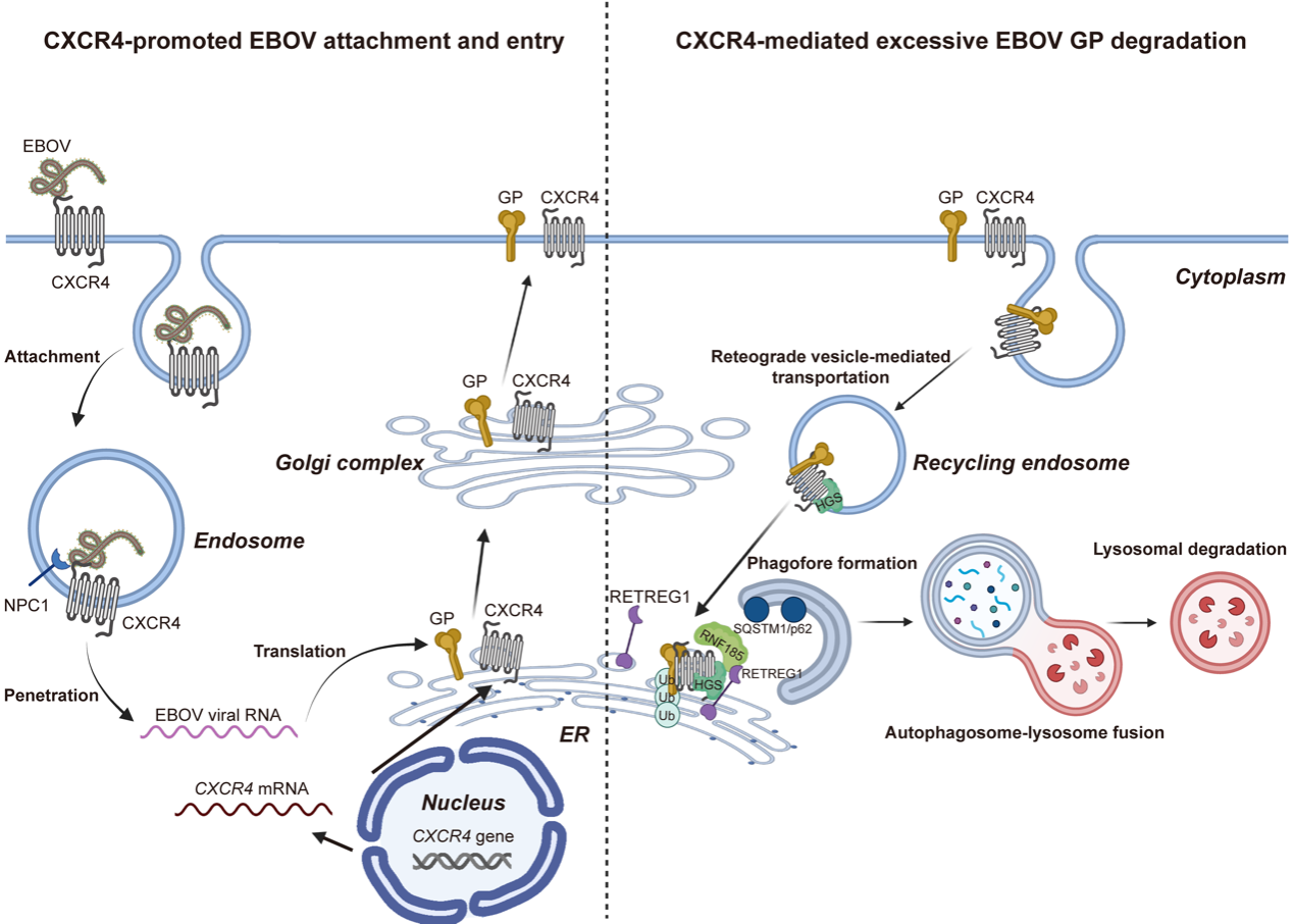 圖注:CXCR4可與EBOV包膜糖蛋白(GP)相互作用,一方面可介導(dǎo)EBOV吸附和進(jìn)入靶細(xì)胞;另一方面可介導(dǎo)具有細(xì)胞毒性的GP蛋白經(jīng)內(nèi)質(zhì)網(wǎng)自噬途徑降解,從而提高病毒適應(yīng)性。