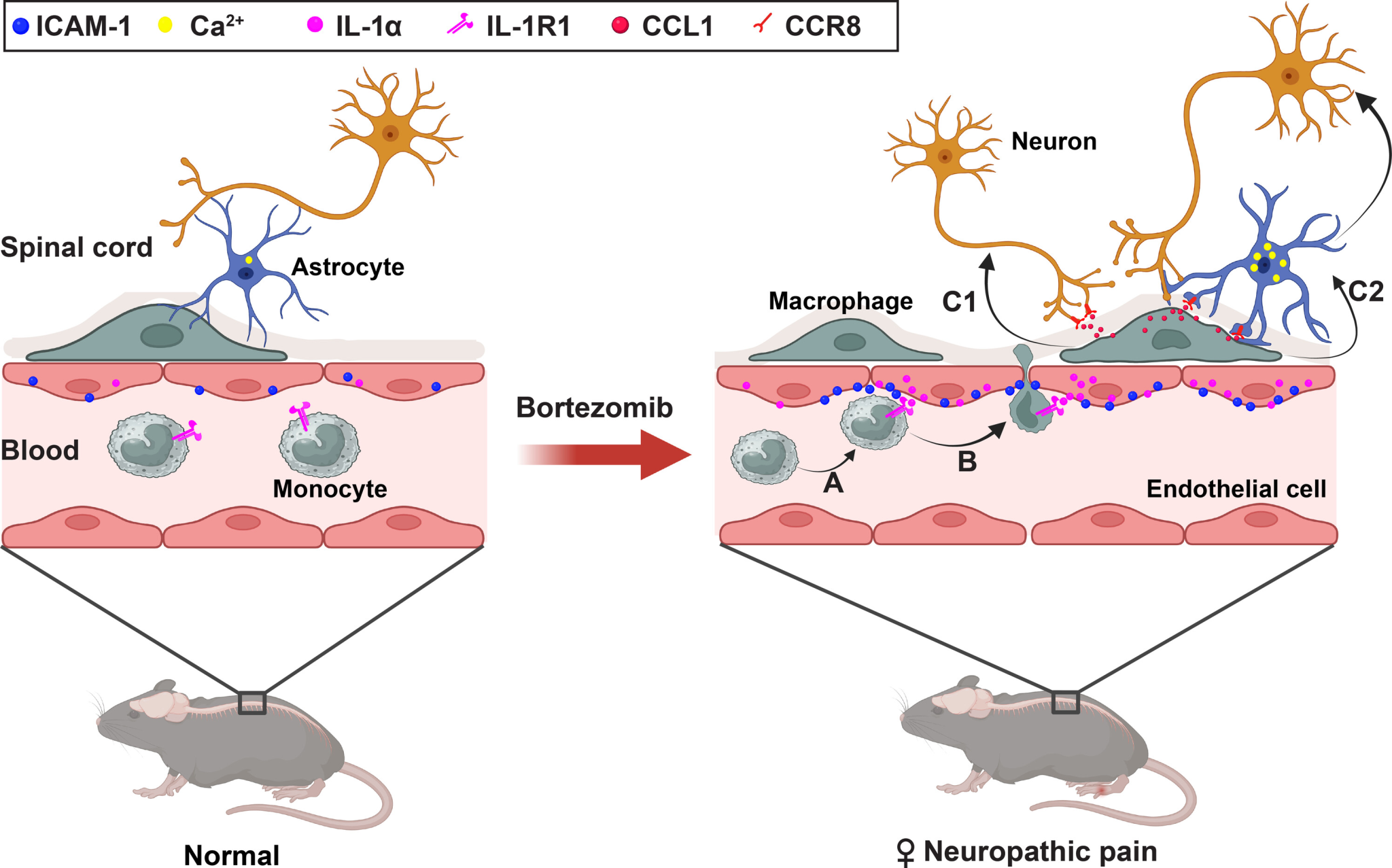 研究團(tuán)隊(duì)首先通過臨床回顧性分析發(fā)現(xiàn),女性多發(fā)性骨髓瘤患者在接受BTZ治療期間更早出現(xiàn)感覺障礙,且該現(xiàn)象不受年齡、疾病分型、分期所影響,提示存在性別特異性的致痛機(jī)制。在C57小鼠模型中,明確了ICAM-1在雌鼠中介導(dǎo)脊髓巨噬細(xì)胞浸潤(rùn),促進(jìn)CCL1釋放并作用于神經(jīng)元與星形膠質(zhì)細(xì)胞,進(jìn)而增強(qiáng)脊髓神經(jīng)元興奮性并誘導(dǎo)早期機(jī)械痛敏。該研究在臨床與動(dòng)物模型中系統(tǒng)性地揭示了硼替佐米誘導(dǎo)的神經(jīng)病理性疼痛在雌性個(gè)體中早期發(fā)生的分子機(jī)制。