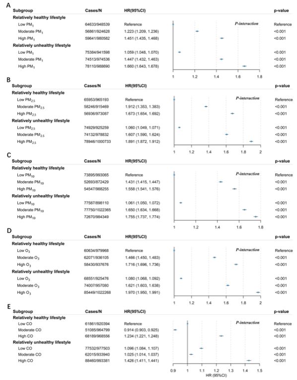 該研究依托超過(guò)580萬(wàn)人的超大規(guī)模隊(duì)列數(shù)據(jù),系統(tǒng)評(píng)估了五種空氣污染物(PM?、PM?.?、PM??、O?、CO)與生活方式對(duì)CVD風(fēng)險(xiǎn)的獨(dú)立及聯(lián)合影響。研究發(fā)現(xiàn),空氣污染和不健康的生活方式均顯著增加CVD風(fēng)險(xiǎn),且在生活方式不健康的人群中,空氣污染的危害效應(yīng)尤為突出。