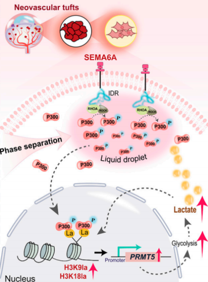 韋艷宏團(tuán)隊(duì)長(zhǎng)期致力于環(huán)境污染物的心血管毒性研究。團(tuán)隊(duì)采用前期建立的應(yīng)激誘導(dǎo)血管病變模型,發(fā)現(xiàn)膜受體Sema6A基于疏水相互作用的相態(tài)轉(zhuǎn)變起始分子事件,并解析其固有無(wú)序區(qū)結(jié)構(gòu)特征及其捕獲表觀遺傳調(diào)控因子P300的空間隔離效應(yīng);通過(guò)聯(lián)合核乳酸化修飾組學(xué)、CUT&Tag技術(shù)及單細(xì)胞分析策略,識(shí)別出組蛋白乳酸化調(diào)控位點(diǎn)H3K9、H3K18和糖酵解代謝關(guān)鍵調(diào)控蛋白Prmt5,闡明驅(qū)動(dòng)血管損傷表型的乳酸平衡紊亂在亞細(xì)胞區(qū)室間的擾動(dòng)狀態(tài)及轉(zhuǎn)錄調(diào)控方式,構(gòu)建膜分子相態(tài)介導(dǎo)的乳酸化修飾異常、甲基轉(zhuǎn)移酶系功能紊亂與糖代謝網(wǎng)絡(luò)失衡的正反饋環(huán)路。
