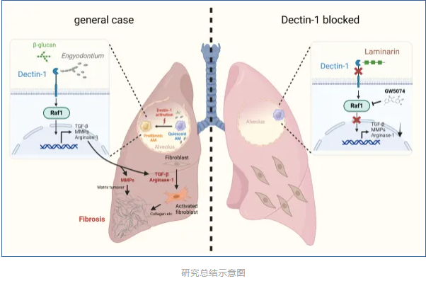 研究團(tuán)隊(duì)在特發(fā)性肺纖維化患者的肺組織樣本和博來(lái)霉素誘導(dǎo)的肺纖維化小鼠模型中都觀察到,Dectin-1的表達(dá)水平顯著上調(diào),且主要分布在肺泡巨噬細(xì)胞群體中。進(jìn)一步的體內(nèi)外實(shí)驗(yàn)證實(shí),Dectin-1活化后,會(huì)促使巨噬細(xì)胞從靜息型轉(zhuǎn)變?yōu)榇倮w維化表型,同時(shí)伴隨TGF-β與金屬基質(zhì)蛋白酶的上調(diào),進(jìn)而促進(jìn)基質(zhì)重構(gòu)和成纖維細(xì)胞活化。