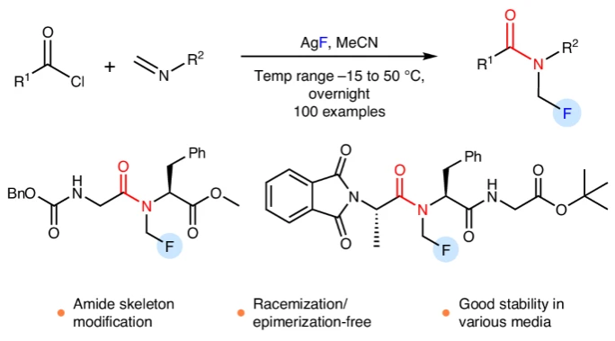 研究發(fā)現(xiàn),通過調(diào)節(jié)反應(yīng)溫度和加料順序,實現(xiàn)了四大類型反應(yīng)(烷基亞胺+芳基酰氯、烷基亞胺+烷基酰氯、芳基亞胺+芳基酰氯、芳基亞胺+烷基酰氯),并具有廣泛的官能團(tuán)兼容性。該反應(yīng)還能應(yīng)用到肽鍵的選擇性N-CH2F修飾,并修飾青霉素、撲熱息痛等藥物,拓展了化合物庫,促進(jìn)了擬肽藥物和生物活性分子的設(shè)計。