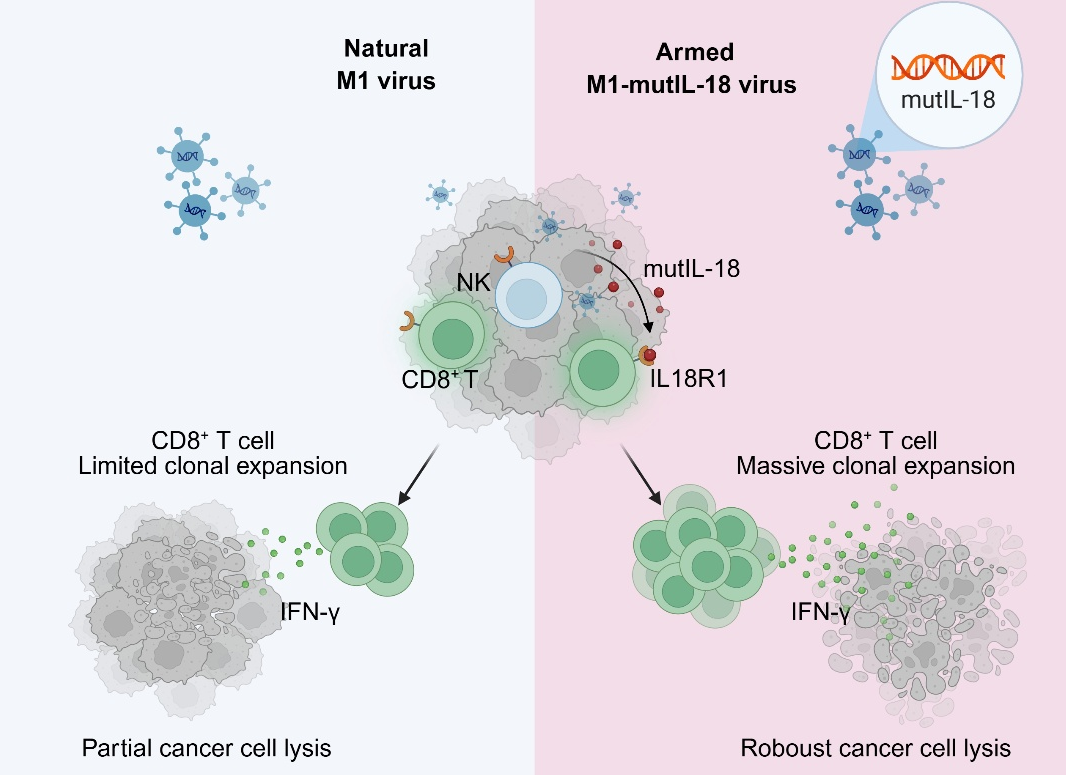 7月3日,中山醫(yī)學(xué)院顏光美教授梁劍開副教授團(tuán)隊(duì)研究發(fā)現(xiàn)溶瘤病毒M1感染可顯著提升腫瘤微環(huán)境中IL-18受體的表達(dá),但配體IL-18的水平未同步增加。基于此,團(tuán)隊(duì)設(shè)計(jì)了一種攜帶突變型IL-18(mutIL-18)的溶瘤病毒M1-mutIL-18。M1-mutIL-18通過激活CD8? T細(xì)胞大量克隆擴(kuò)增,促進(jìn)IFN-γ的持續(xù)釋放,形成抗腫瘤免疫的正循環(huán),在多種晚期實(shí)體瘤模型中展現(xiàn)出高效、持久的抗腫瘤效果。相關(guān)成果發(fā)表在《自然—通訊》(Nature Communications)上。