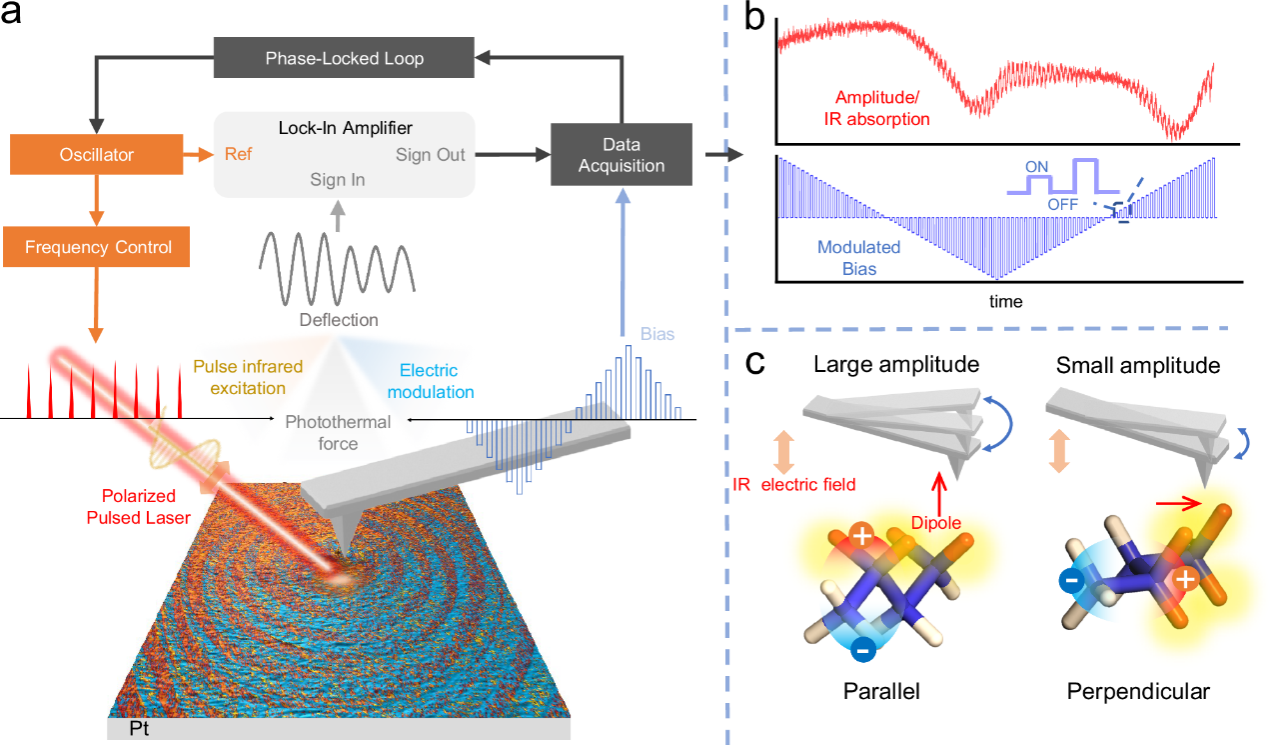 中大新聞網(wǎng)訊(通訊員姚松佑)近日,中山大學(xué)物理學(xué)院、廣東省磁電物性分析與器件重點(diǎn)實(shí)驗(yàn)室張瀟悅副教授課題組提出了一種電控光熱力顯微鏡技術(shù)(Electrically Modulated Photothermal Force Microscopy, ePTFM),其在納米尺度上實(shí)現(xiàn)了極性演化過(guò)程中有機(jī)極性基團(tuán)和極性鍵取向、構(gòu)象的特異性表征,可有效研究電驅(qū)動(dòng)下極化與化學(xué)結(jié)構(gòu)演變的耦合關(guān)系。相關(guān)研究成果發(fā)表于《自然·通訊》。