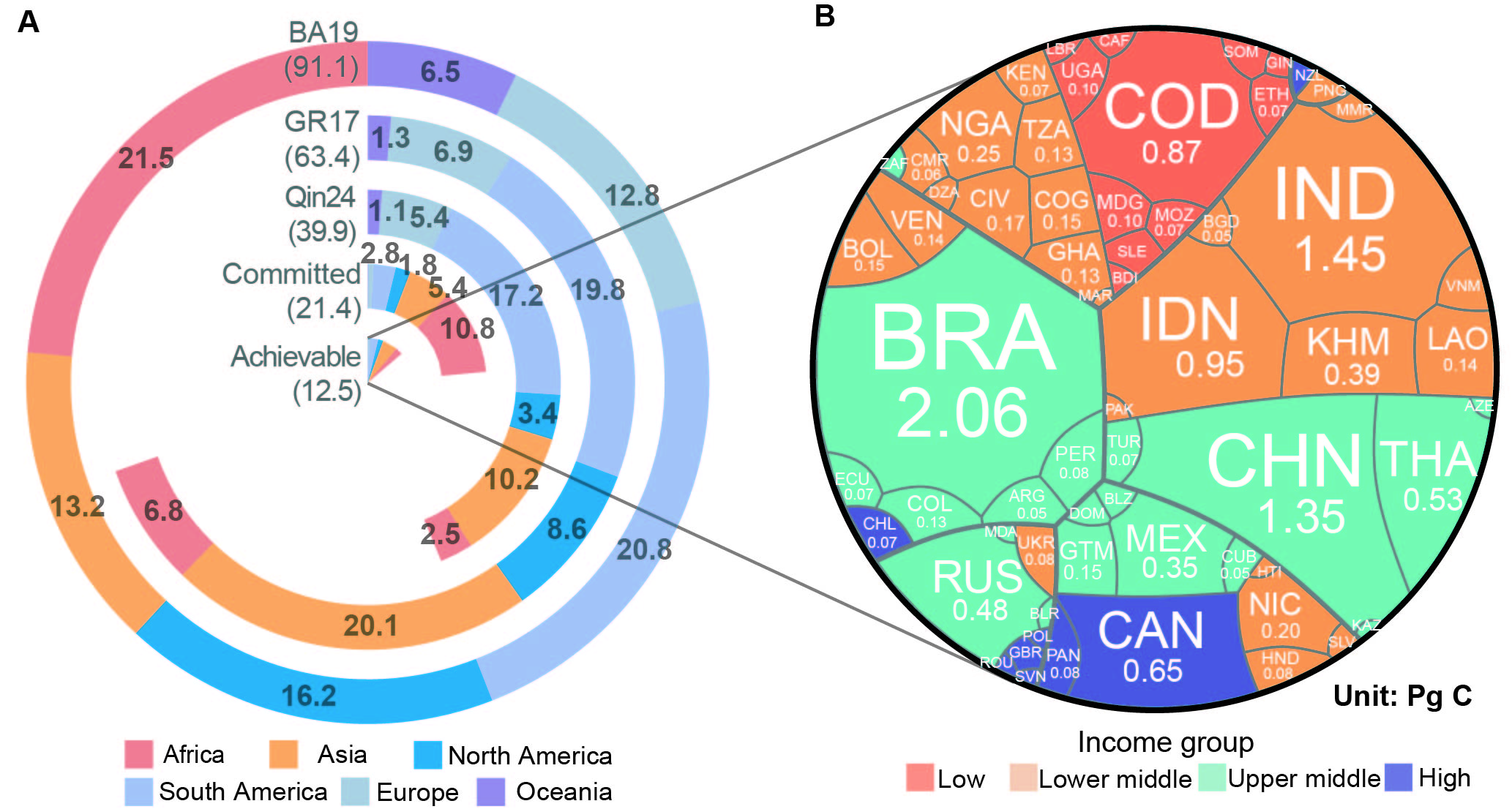基于不同造林假設(shè)估算的氣候緩解潛力。 (A)全球和區(qū)域尺度造林固碳潛力因情景而異。(B)目前可實現(xiàn)的氣候緩解潛力的國家和收入群體分布。