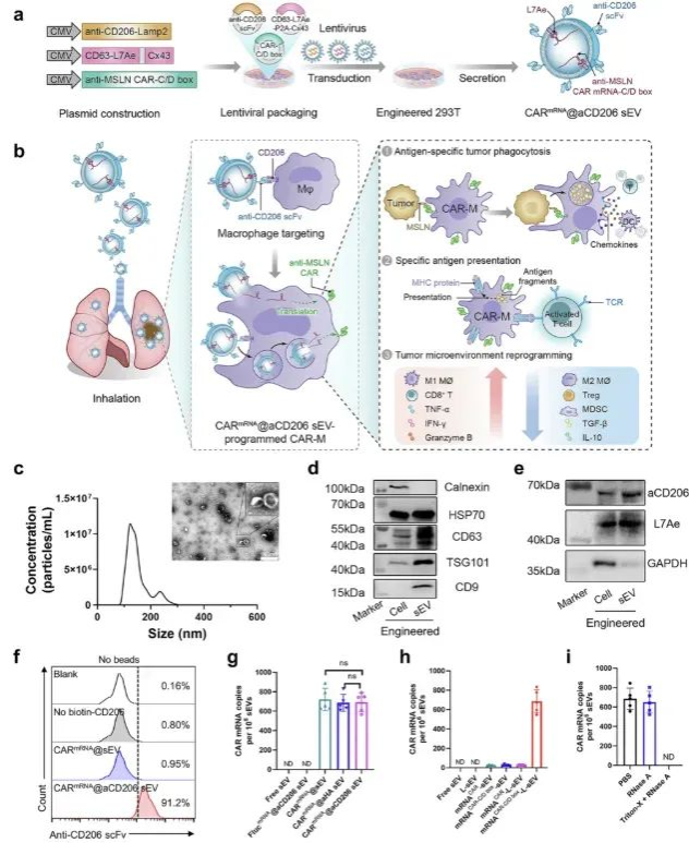 傳統(tǒng)的CAR-M制造工藝復(fù)雜,且細(xì)胞通過(guò)靜脈注射后大多滯留在肝臟,難以有效到達(dá)肺部病灶。針對(duì)這一難題,黃曦教授團(tuán)隊(duì)設(shè)計(jì)了一種巧妙的“原位改造”方案:他們成功構(gòu)建了一種工程化的小細(xì)胞外囊泡(sEV),其表面整合了靶向巨噬細(xì)胞的抗體(抗CD206 scFv),內(nèi)部裝載了可編碼識(shí)別腫瘤抗原間皮素的CAR結(jié)構(gòu)的mRNA。