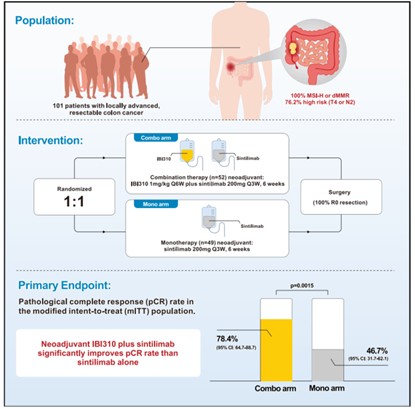 本研究是一項隨機對照、開放標簽、多中心1b期臨床試驗(NCT05890742),研究共納入101名局部晚期可切除MSI-H/dMMR結腸癌患者,隨機分配雙免疫方案組(n=52),接受伊匹木單抗N01注射液(IBI310)+信迪利單抗治療,共2個治療周期;或單藥組(n=49),接受信迪利單抗單藥治療。新輔助治療后進行手術評估。主要終點為改良意向治療人群(mITT)(接受至少一次新輔助治療且完成手術)的pCR率,次要終點包括無事件生存期(EFS)、總生存期(OS)、R0切除率和安全性。