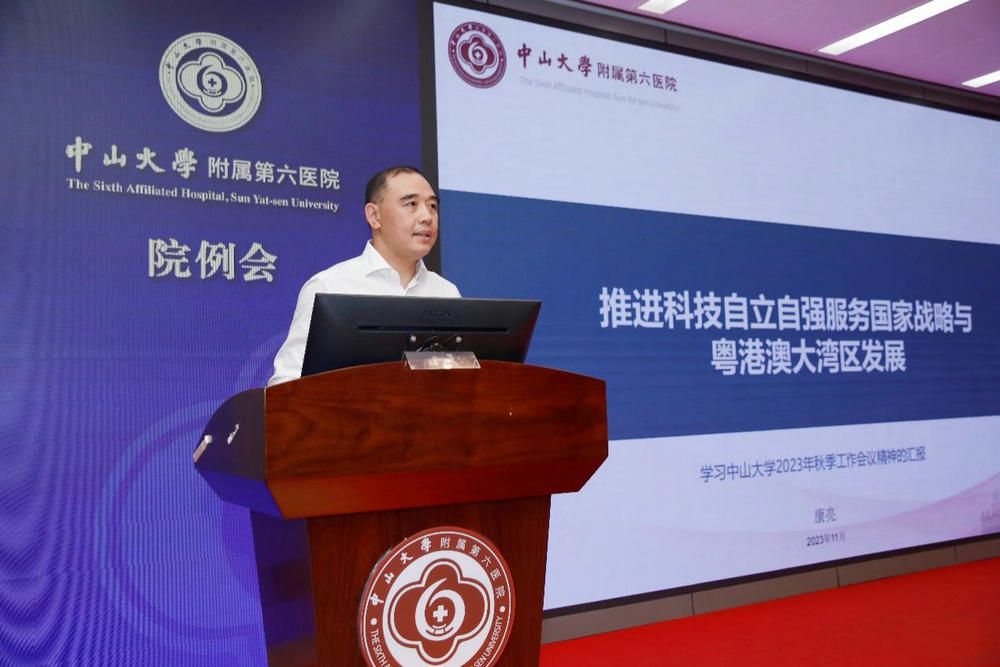 會(huì)上,附屬第六醫(yī)院副院長(zhǎng)康亮重點(diǎn)傳達(dá)了高松校長(zhǎng)以“推進(jìn)科技自立自強(qiáng),服務(wù)國(guó)家戰(zhàn)略與粵港澳大灣區(qū)發(fā)展”為主題的大會(huì)報(bào)告,報(bào)告指明了學(xué)??蒲泄ぷ鞲哔|(zhì)量?jī)?nèi)涵式發(fā)展的機(jī)遇、路徑、理念與措施,強(qiáng)調(diào)了學(xué)校堅(jiān)持教育、科技、人才一體統(tǒng)籌推進(jìn),做到“立足灣區(qū)與面向世界、學(xué)術(shù)前沿與學(xué)科交叉、目標(biāo)導(dǎo)向與自由探索、科學(xué)價(jià)值與應(yīng)用價(jià)值、科研創(chuàng)新與制度創(chuàng)新”五個(gè)結(jié)合,努力為全面建設(shè)社會(huì)主義現(xiàn)代化國(guó)家提供重要支撐。康亮副院長(zhǎng)結(jié)合醫(yī)院科研工作提出,醫(yī)院要進(jìn)一步提高站位,積極響應(yīng)國(guó)家和大學(xué)的號(hào)召,主動(dòng)與兄弟單位合作,發(fā)揮優(yōu)勢(shì)特色,落實(shí)重大項(xiàng)目建設(shè),助力粵港澳大灣區(qū)協(xié)同發(fā)展。