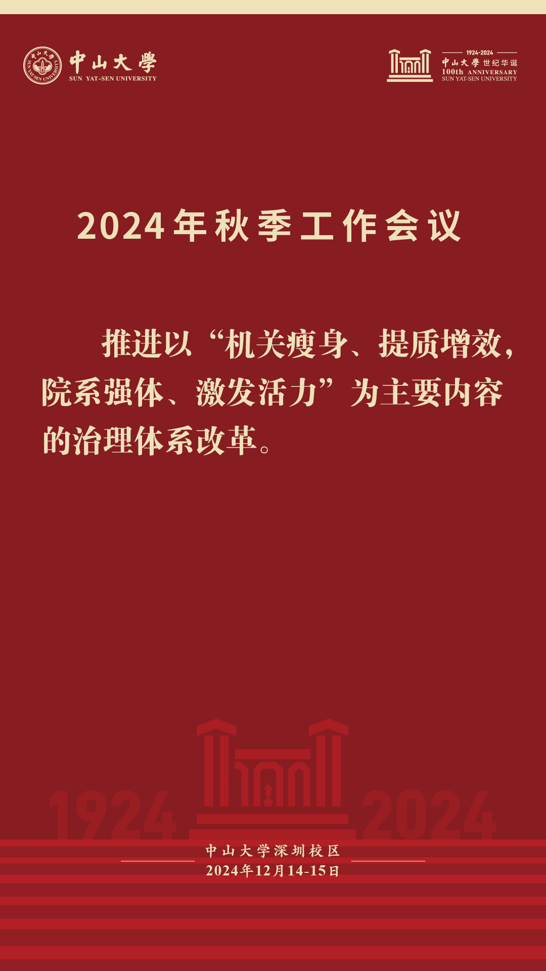會(huì)上,高松校長(zhǎng)帶領(lǐng)參會(huì)人員再次學(xué)習(xí)習(xí)近平總書記致中山大學(xué)建校100周年的賀信。他表示,賀信充分體現(xiàn)了習(xí)近平總書記和黨中央對(duì)中山大學(xué)的親切關(guān)懷和深情厚愛,高瞻遠(yuǎn)矚、意義深遠(yuǎn),內(nèi)涵豐富、思想深刻,為我們奮進(jìn)新百年新征程提供了根本遵循和行動(dòng)指南。他強(qiáng)調(diào),我們召開本次秋季工作會(huì)議,目的就是進(jìn)一步深入學(xué)習(xí)貫徹習(xí)近平總書記重要賀信精神,一體落實(shí)黨的二十屆三中全會(huì)和全國(guó)教育大會(huì)精神,堅(jiān)持目標(biāo)導(dǎo)向和問題導(dǎo)向相結(jié)合,推動(dòng)學(xué)校治理體系改革,著力提升治理能力,促進(jìn)學(xué)校新百年高質(zhì)量?jī)?nèi)涵式發(fā)展。