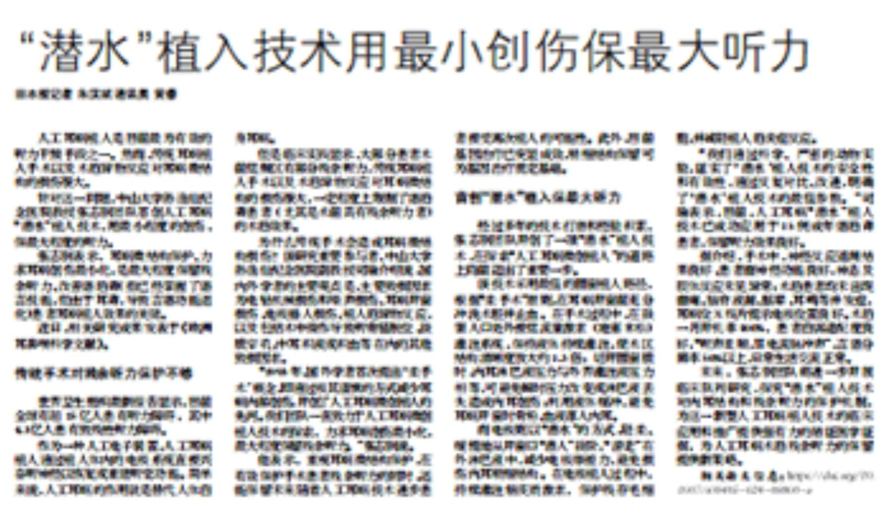 人工耳蝸植入是目前最為有效的聽力干預手段之一。然而,傳統(tǒng)耳蝸植入手術以及術后異物反應對耳蝸微結構的損傷很大。針對這一問題,中山大學孫逸仙紀念醫(yī)院教授張志鋼團隊首創(chuàng)人工耳蝸“潛水”植入技術,用最小程度的創(chuàng)傷,保最大程度的聽力。張志鋼表示,耳蝸微結構保護、力求耳蝸創(chuàng)傷最小化,是最大程度保留殘余聽力、...
