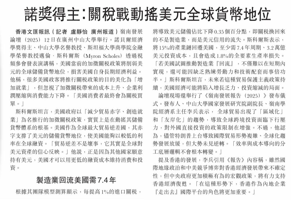 嶺南發(fā)展論壇(2025)12日在廣州中山大學(xué)舉行。諾貝爾經(jīng)濟(jì)學(xué)獎(jiǎng)得主、中山大學(xué)名譽(yù)教授、斯坦福大學(xué)商學(xué)院金融學(xué)榮譽(yù)教授邁倫·斯科爾斯(Myron Scholes)透過視頻參會(huì)發(fā)表演講稱,美國(guó)當(dāng)前的加征關(guān)稅政策將削弱美元的全球儲(chǔ)備貨幣地位,損害美國(guó)自身長(zhǎng)期經(jīng)濟(jì)利益。他稱,很多美國(guó)政客將推行關(guān)稅政策的目的美化為「增加就...