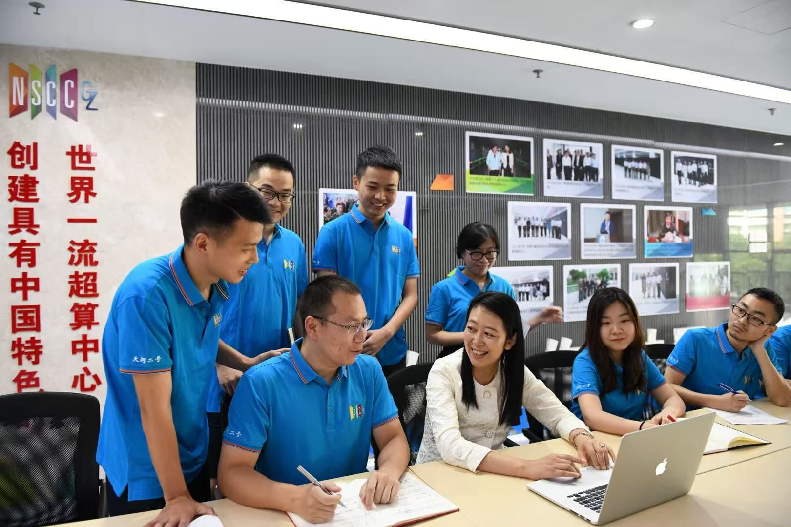國家超級計算廣州中心主任、中山大學計算機學院教授盧宇彤(前排右三)與同事交流。
