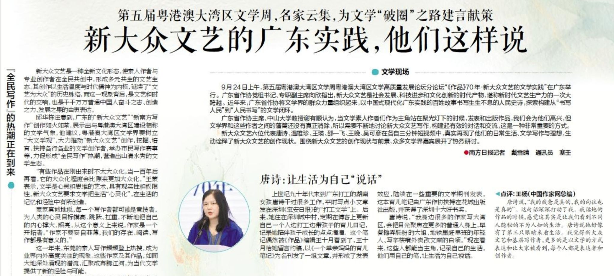 9月24日上午,第五屆粵港澳大灣區(qū)文學(xué)周粵港澳大灣區(qū)文學(xué)高質(zhì)量發(fā)展論壇分論壇“《作品》70年·新大眾文藝的文學(xué)實踐”在廣東舉行。廣東省作協(xié)黨組書記、專職副主席向欣指出,新大眾文藝是社會發(fā)展、科技進(jìn)步和文化創(chuàng)新的時代產(chǎn)物,堪稱新時代文藝生產(chǎn)力的一次大跨越。近年來,廣東省作協(xié)將文學(xué)界的群眾力量組織起來,以...